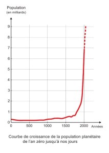 Le hic c’est que notre orange bleue est un espace fini, aux ressources limitées, un écosystème global fragile alors qu’en dépit de tous les malheurs qu’elle a connus ou qu’elle s’est infligée, l’humanité ne cesse de croître et de prospérer aux dépens des autres espèces vivantes. En ce début de XXI° siècle, croissance économique et croissance démographique se répondent, se challengent comme deux compétiteurs fous. La courbe de la population mondiale est plus qu’inquiétante et l’on se demande bien, même si certains démographes prédisent qu’elle se retournera dans quelques décennies, comment cette croissance exponentielle pourrait-elle s’arrêter? Au prix de quelle apocalypse ?